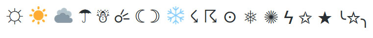 ☼ ☀ ☁ ☂ ☃ ☄ ☾ ☽ ❄ ☇ ☈ ⊙ ❅ ✺ ϟ ✩ ★ ╰☆╮
